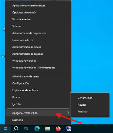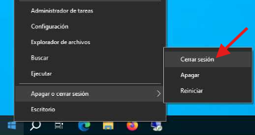 En este menú debemos posicionarnos con el mouse sobre "Apagar o cerrar sesión" para visualizar un submenú en el cual se no dan varias opciones, entre ella la de Cerrar sesión.